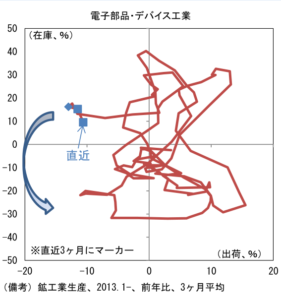 - この結果、出荷・在庫バランス(両者の前年比差分から算出)は▲14.2%、3ヶ月平均で▲20.0%へとマイナス幅縮小。在庫循環図の位置取りは、3月に左上方向へ逆走していたものが4月以降は左回りの経路に復し5月は右下方向(在庫減・出荷増)へと前進、在庫調整の進展を窺わせる動きとなった。