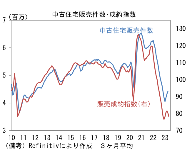 - 5月米中古住宅販売成約指数は前月比▲2.7%と3ヶ月連続の低下。前年比では▲20.8%であった。住宅の買い替えに伴う住宅ローン金利の負担増加を嫌い、住宅売却を躊躇う人が増加し、その結果として市場に出回る物件が減少し、販売に下押し圧力がかかっている。