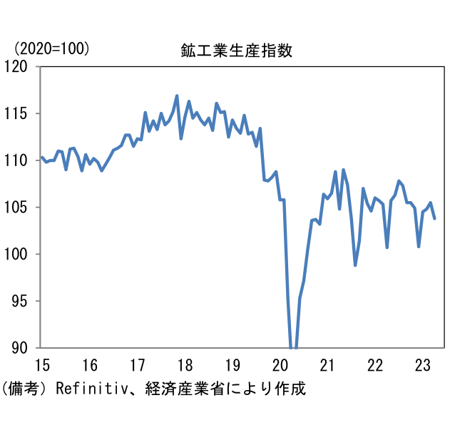 株式市場と関連の深い電子部品・デバイス工業の生産に目を向けると、5月の生産は前月比▲4.0%となった。指数水準は92.0へ低下し、2019年平均(98.7)を下回っているが、前年比では▲12.1%へとマイナス幅は縮小した(5月は▲12.5%)。2022年以降はノートPCやスマホなどの需要減衰を背景とするシリコンサイクルの悪化に巻き込まれ、本邦IT関連財企業はその勢いを失っているが、ここへ来て底打ち感がみられている(半導体製造装置も似た構図)。生産計画に目を向けると6月は+1.9%、7月は+5.6%と2ヶ月連続の増産見込み。また5月は出荷のマイナス幅が縮小すると同時に在庫のプラス幅が前年比+5.8%へと縮小。在庫は前月比でも▲6.6%と3ヶ月連続の減少となっている。需給バランスの改善は素直に好感すべきだろう。