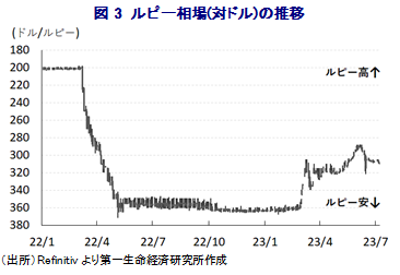 スリランカでは昨年、外貨不足に伴いデフォルトに陥るとともに、インフレ昂進に伴う国民生活の悪化が政情不安を招いて政権交代に発展した。ウィクラマシンハ政権の下でIMFからの支援受け入れのほか、債務再編協議が進められている。同政権は年内の債務再編実現を目指す姿勢をみせるが、現時点においてその行方は不透明な状況が続く。他方、昨年大きく上振れしたインフレ率は足下で大きく低下しており、中銀は先月と今月と相次いで利下げに動くなど経済を取り巻く状況は改善に向かいつつある。議会は国内債務の再編計画を承認するなど着実に取り組みを前進させており、当面は債務再編協議の行方に注目が集まろう。