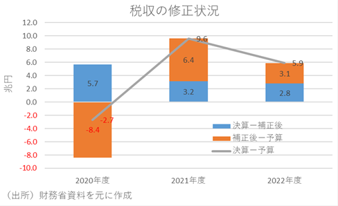 近年、国の税収が上振れている。当初予算との対比でみれば、2021~2022年度にかけて2年連続で上振れており、平均上振れ額は+7.7兆円にも上る。また、補正後予算との対比では2020~2022年度にかけて3年連続で上振れしており、平均上振れ額は+3.9兆円となっている。