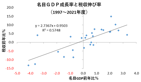- 経済が長期停滞下で欠損法人割合が不安定な状況で高めの税収弾性値を前提とすると、緊縮財政を実施しても名目成長率が下がってしまうことで、税収が期待通り増えるとは限らないということを示している。つまり、経済成長と税収の関係を鶏と卵に例えれば、税収という卵を産む経済成長、すなわち鶏を減らすような緊縮財政を過度に行えば、却って財政健全化は遠のきかねないことになる。