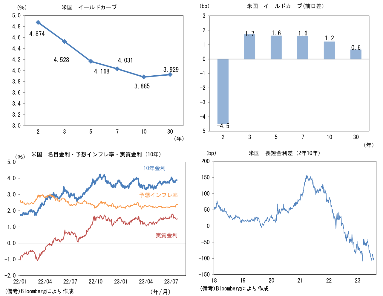 - 米金利は3年金利以降が上昇。予想インフレ率(10年BEI)は2.384%(▲1.2bp)へと低下。 実質金利は1.498%(+2.5bp)へと上昇。長短金利差(2年10年)は▲99.6bpへとマイナス幅縮小。
