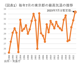2023年7月の夏は、異様に暑い。地球温暖化に対して、強烈な危機感を感じる。東京都の最高気温の平均を調べてみると、2023年7月は過去最高になる可能性がある(図表1)。気象庁のデータでは、7月27日時点のHPの平均値では33.4℃(暫定値、これまでの日次平均)と、2018年7月の最高を抜いている。7月が暑いと今年の8月も高い気温になりそうだ。おそらく、2023年は7・8月を通じて、東京都(あるいは全国的に)は、過去最高になるのではないかと警戒している。