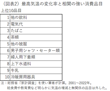 この猛暑に伴って、どんな消費品目が連動して変化するのかを調べてみた。猛暑の年(7・8月平均の最高気温)の気温変動率と、総務省「家計調査」の品目の実質消費・前年比(7・8月平均)について、その関連性(相関係数)を調べた。そこからは、暑い夏ほど変化しやすい消費品目は何かがわかる。暑い夏と関連が深かった2つの品目は、1位が「他の飲料」、2位が「電気代」だった(図表2)。この2つは特に気温との関連性が強い。