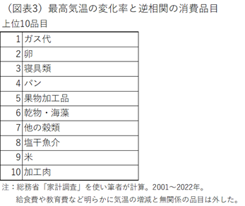 消費品目の中で、猛暑になると逆に支出が減る関係が強いものを10品目ほどリストアップしてみた(図表3)。1位は「ガス代」である。暑いときは、コンロに火をつけることも躊躇してしまう。なるべく、料理はコンロを使って、その間近で料理をしなくても済むものになっていく。2位の「卵」は、やはり、目玉焼きやゆで卵を作ることが猛暑では敬遠されるからなのだろう。3位の「寝具類」は、掛け布団などを使わなくなるからだろう。個々にみれば夏用の寝具を買う人もいるだろうが、総体では減少しやすい。