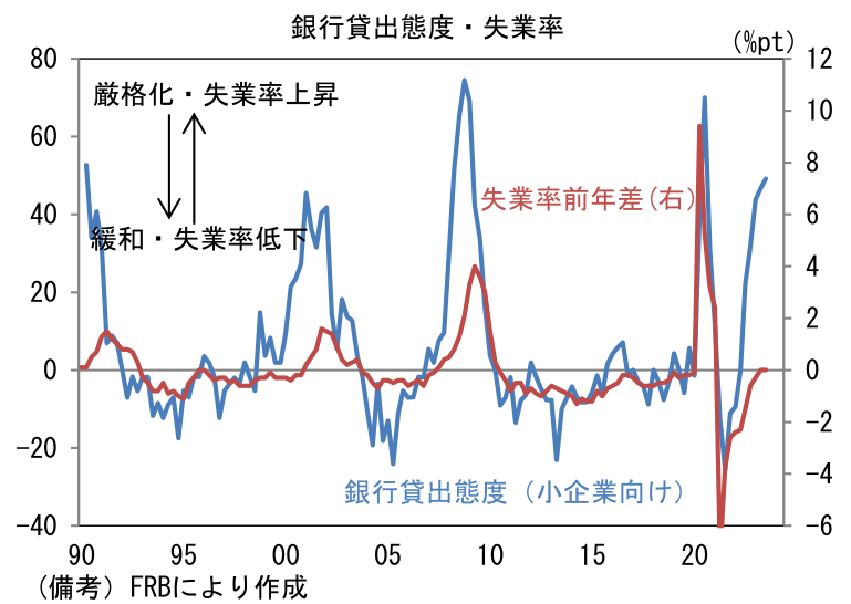 なお、上述の「リスク管理の甘い企業」について、投資家がそのリスクを軽視している可能性に一定の留意が必要。銀行貸出態度の厳格化に対して投機的格付け企業の社債利回り(スプレッド)は不可解なほど低位で安定している。