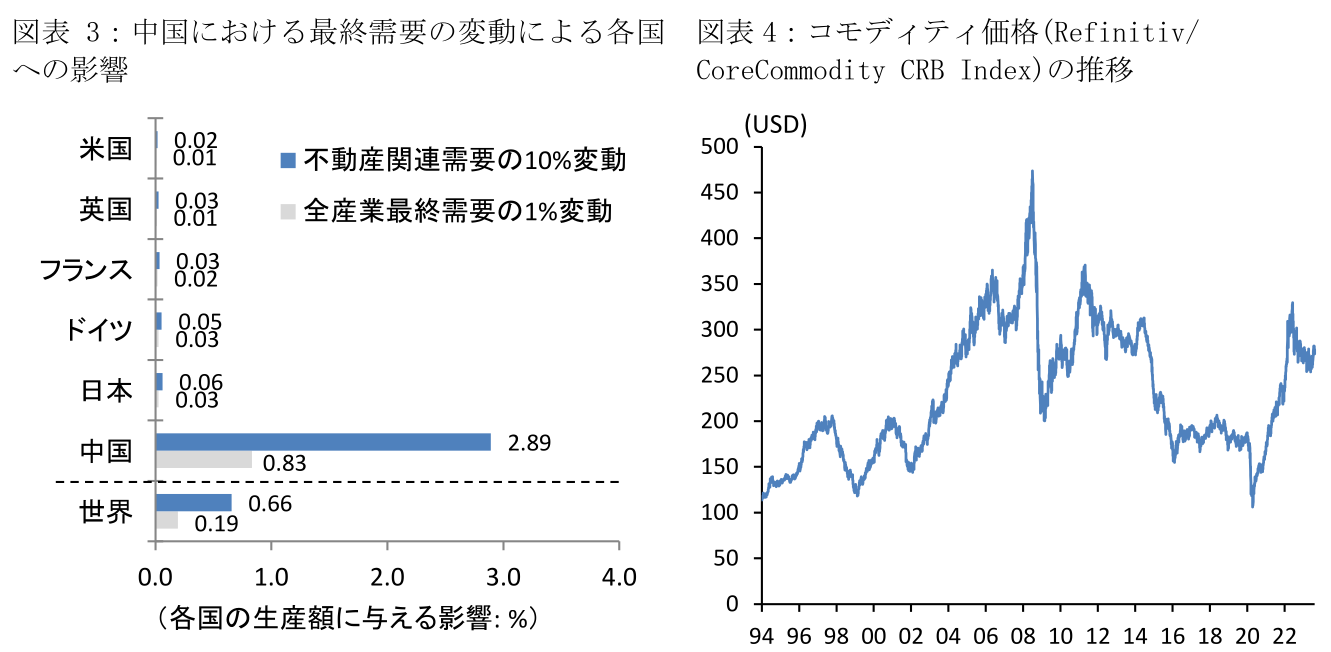 なお国際産業連関表を用いた本試算は、一定時点の投入構造が不変と仮定していることに留意が必要である。中国の不動産市場の不振が銀行の貸出態度悪化などに波及し広範な経済活動を抑制する場合、中国経済への影響は増幅する3。加えて、こうした中国経済の景気減速懸念が国際的な株安などを招く場合、世界的な景気への悪影響も増幅するかたちとなる。