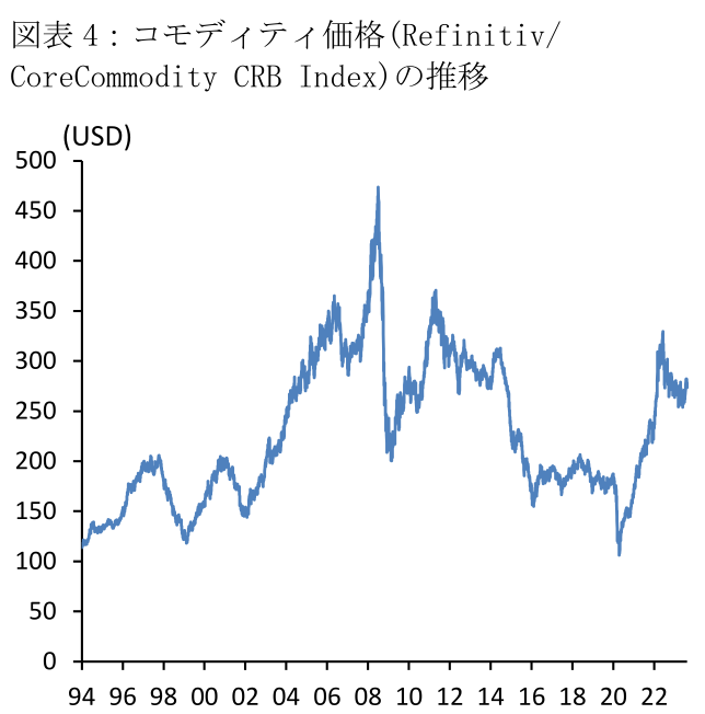 - 中国における不動産関連産業は世界の20.2%を占めるなど、こうした不振がコモディティ価格に波及する可能性に留意が必要だ。コモディティ価格の下落が世界的なディスインフレ圧力となり、CPIが2%を下回る推移となる場合、世界的な利下げ局面への転換点に繋がる可能性がある。