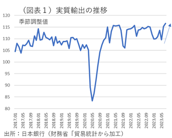 しかし、本当にそうした先入観は正しいのだろうか。貿易統計からみると、前向きな動きが感じられる。実質輸出(輸出数量)は、2023年1月を大底にして、均してみると、徐々に反転上昇してきている(図表1)。中国向けは低調だが、欧州・米国向けの自動車が伸びている。