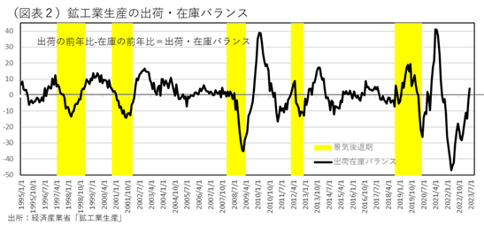 こうした輸出の動向は、日本の生産活動全体に波及していくだろう。生産サイクルの変化を占う上で、よく使用される出荷・在庫バランスの推移でみても、2023年6月にはプラスに浮上している(図表2)。これは、在庫循環から考えて、しばらくは上向きの流れが継続するサインである。2023年内くらいは、生産回復基調は維持できるとみて違和感はないと思う。つまり、景気拡大期は、まだ十分に保たれると筆者は考える。