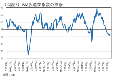 多くの人が、米国の金融引き締めを強く警戒している。この点についての理解も、よく吟味してみる必要がある。米国では、2022年3月から利上げが開始されて、まだ打ち止めかどうかもわからない。9月か、あるいは10~12月に+0.25%の追加利上げの可能性がある。米国の代表的な指標であるISM製造業指数が、2022年から大きく落ち込んでいる(図表3)。好不況の境目になる50を割り込んで久しい。足元の輸出数量は、リバウンドしていても、ISM製造業指数が低迷していては、米国向けの輸出増には自信が持てないということになる。
