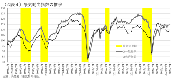 生産面だけをみていると、2022年は景気後退でもおかしくはなかった。日本の景気動向指数でも、CI先行指数はずっと下方トレンドで、CI先行指数は何とか堅調を維持した(図表4)。だから、総じてみると、2022年は「踊り場」だったと理解できる。