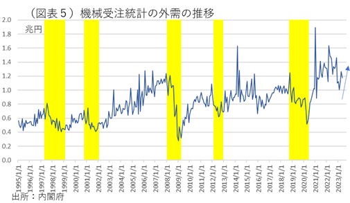 個人的に大いに注目している指標には、内閣府「機械受注」の外需がある。実は、日本の機械受注統計は、国内・民需よりも、外需の方が金額が大きくなっている。2023年4~6月では、国内・民需1.0兆円(季節調整値)に対して、外需は1.2兆円である。人々には、行動経済学で言われる「正常性バイアス」が働き、機械受注統計をみるとき、国内民需に注目する習慣が付いている。長期時系列で、機械受注の外需の推移をみると、データが底入れすると、景気後退期から拡大期に転じていることが多い(図表5)。そうした点で、外需をみると、2023年3月を底にいくらか上向きになっている。貿易統計だけをみていると、自動車が半導体不足の緩和で立ち上がっている姿になるが、この機械受注・外需を併せてみると、外需の裾野が回復している変化もわかる。
