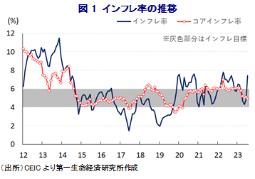 - 昨年末にかけての同国経済は物価高と金利高の共存に加え、世界経済の減速も重なりテクニカル・リセッションに陥った。しかし、その後はインフレが鈍化したほか、インフラ投資の進捗が景気の底打ちを促した。4-6月の実質GDP成長率も前年比+7.8%と加速しており、インフレ鈍化による家計消費の押し上げに加え、企業部門の設備投資も活発化するなど内需が景気を押し上げている。ただし、サービス業の生産は大きく押し上げられる一方、農林漁業の生産は低迷するなど供給懸念が物価を押し上げる懸念がくすぶる。