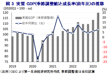 なお、昨年末にかけての同国経済は物価高と金利高の共存が家計消費をはじめとする内需の足かせになるとともに、世界経済の減速懸念の高まりが外需の重石となり、前年比ベースの実質GDP成長率はプラス成長ながら、当研究所が試算した季節調整値に基づく前期比年率ベースでは2四半期連続のマイナス成長となるなどテクニカル・リセッションに陥った(注3)。しかし、昨年末以降はインフレ要因となった商品高の動きが一巡するとともに、米ドル高も一服してインフレ率が頭打ちの動きを強めたことに加え、年明け直後は年度末にかけての公共投資の進捗促進の動きも追い風に景気は一転底打ちしたことが確認された。さらに、4-6月の実質GDP成長率は前年同期比+7.8%と前期(同+6.1%)から一段と加速して丸1年ぶりの伸びとなっているほか、当研究所が試算した季節調整値に基づく前期比年率ベースでも2四半期連続のプラス成長になるとともに、大幅に伸びが加速するなど景気は底入れの動きを強めている様子がうかがえる。同時期についてはインフレが鈍化して実質購買力が押し上げられたほか、中銀も利上げ局面の休止に舵を切ったことも重なり、家計消費が活発化して景気拡大の動きをけん引しているほか、景気回復期待の高まりや世界的なデリスキング(リスク低減)を目的とするサプライチェーン見直しの動きも追い風に企業部門による設備投資の動きも活発化するなど、幅広く内需が拡大する動きが確認出来る。他方、前期は年度末にかけての公共投資の進捗が景気底打ちを促したものの、今期については一転してその動きに一服感が出ているほか、世界経済の減速懸念の高まりを反映して輸出に下押し圧力が掛かるなど外需は下振れしている。結果、内需の堅調さを反映して輸入が大幅に拡大していることから、純輸出(輸出-輸入)の成長率寄与度は前年比、前期比年率問わず大幅マイナスとなっており、足下の景気実態は見た目以上に底入れの動きを強めていると捉えられる。こうした動きは分野別の生産活動の動きにも現れており、家計消費の活発化を反映してサービス業の生産が大きく押し上げられている。ただし、内需の堅調さの一方で外需に不透明感が高まっていることを反映して製造業の生産拡大の動きには一服感が出ているほか、公共投資の進捗鈍化を受けて建設業の生産も鈍化する動きがみられる。さらに、雨季の雨量が例年を大きく下回っていることを反映して農林漁業関連の生産は弱含んでおり、今後は供給不足に伴う物価上昇圧力が強まる可能性が高まっている。その意味では、コメやタマネギ以外の食料品を対象に輸出規制を強化することも予想され、同国経済は構造面で外需依存度が比較的低いものの、先行きの景気に少なからず悪影響を与える可能性はくすぶる。