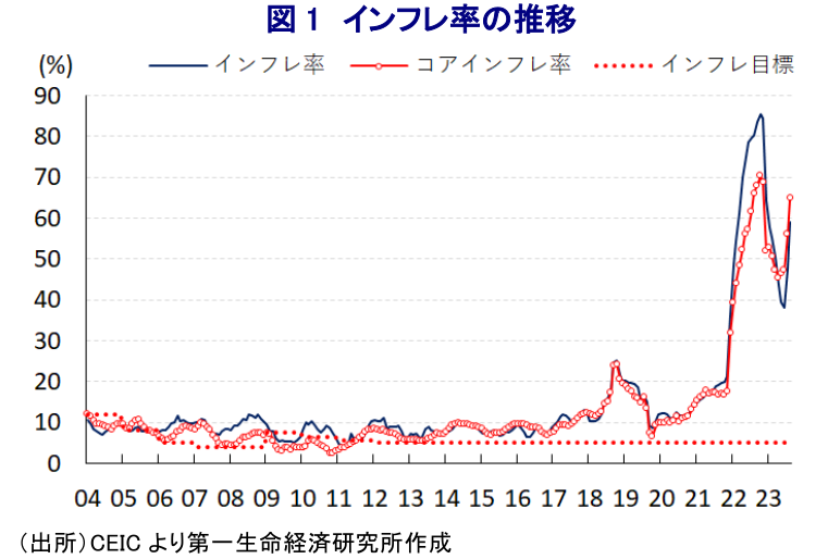 ここ数年のトルコでは、『金利の敵』を自任するエルドアン大統領の下、中銀はインフレが昂進する状況にも拘らず利下げを実施する展開が続くなど、経済学の定石では考えられない政策運営がなされてきた。結果、通貨リラ相場は調整局面が続いて輸入インフレを招く状況が続いてきたほか、昨年はウクライナ情勢の悪化をきっかけとする商品高に加え、コロナ禍からの景気回復の動きも重なり、インフレ率は大きく上振れする事態を招いた。さらに、昨年末にかけては大きく上振れしたインフレ率が頭打ちに転じたため、中銀は断続利下げに動いたほか、今年2月に発生した大地震の直後も復興支援を目的に追加利下げに動くなど、景気下支えを重視する姿勢をみせてきた。中銀がこうした動きをみせた背後には、エルドアン大統領にとって今年5月の大統領選での再選、及び大国民議会選での与党AKP(公正発展党)の党勢拡大が至上命題となってきたことが大きいと捉えられる。エルドアン氏は大統領選で再選を果たしたものの、長期に亘るインフレとリラ安が国民生活の悪化を招いており、大統領選では予想外の苦戦を強いられたこともあり、大統領選後の内閣改造では政策の方向転換を示唆する動きをみせた。具体的には、財務相に金融市場からの信認が厚いシムシェキ氏を、中銀総裁には金融業界での経験が長いエルカン氏を据えることにより、上述の政策運営に伴い失墜してきた国際金融市場からの信頼回復を意識した人事に動いた(注1)。なお、新体制の下で中銀は6月、7月と利上げ実施に動いたものの、事前予想に比べて小幅な利上げに留めたこと、リラ相場を実質的に下支えしてきた政策の転換が図られるとの見方を反映して、反ってその後はリラ安の動きに拍車が掛かる事態となった。さらに、政府がインフレ対応を目的に最低賃金の大幅引き上げに動いたことに加え、復興需要の発現、リラ安による輸入インフレも重なりインフレ率は反転上昇に転じるとともに、足下では一段と加速している。なお、中銀は先月の定例会合では事前予想を上回る大幅利上げに舵を切るとともに、マクロプルーデンス政策の簡素化に動くなど『正統的』な政策を後押しする姿勢をみせたほか、先行きの政策運営もインフレの鎮静化に向けて適時、且つ漸進的に必要なだけ引き締め姿勢を強める考えをみせた(注2)。このように中銀は『本気』の姿勢をみせる一方、その後も金融市場においてはリラ安圧力がくすぶるなどその『真意』を定めあぐねる展開が続いており、その背景には過去の中銀による政策運営がエルドアン大統領の意向により捻じ曲げられてきたことが影響しているとみられた。こうしたなか、政府は6日に中期計画を公表し、先行きのインフレ見通しについて今年末時点は+65%、来年末時点は+33%に抑える方針が示されたものの、上述のように足下のインフレ率が再加速している状況を勘案すれば、この実現のためにはさらなる金融引き締めが不可欠になると見込まれる。なお、中期計画の公表に際してエルドアン大統領は「経済成長に妥協するつもりはない」とする一方、「緊縮的な金融政策によりインフレを一桁に抑える」、「ディスインフレプロセスは輸出主導による持続可能な経済成長に資するなど経常収支の改善に繋がる」との考えを示した。また、「保護預金制度は為替レートの安定に繋がった」としつつ、「保護預金制度の対象となる預金をリラ建預金に転換させる」と述べるなど中銀が計画する保護預金制度(リラ建の定期預金を対象にリラ相場が想定利回りを上回る水準に調整した場合にその損失分をすべて政府が補填する制度)の解除を後押しする考えを示した。この発言は、エルドアン大統領が中銀による利上げ実施を是認するなど『変心』を示唆したものと捉えられる一方、この発言を受けてリラ相場は一時的に上昇するも直後には上昇分が消え失せるなど金融市場は信用していない様子もうかがえる。その背景には、先行きの景気を巡って国内・外双方で不透明要因が山積しており(注3)、来年3月の統一地方選挙が近付くなかで最終的にエルドアン氏の『堪忍袋の緒』が切れることを懸念していると考えられる。過去にもエルドアン氏は中銀による金融引き締めを一旦是認する姿勢をみせるも、その後は総裁更迭など人事介入を繰り返してきたことを勘案すれば、今回の発言のみを以って判断することは難しいと言える。