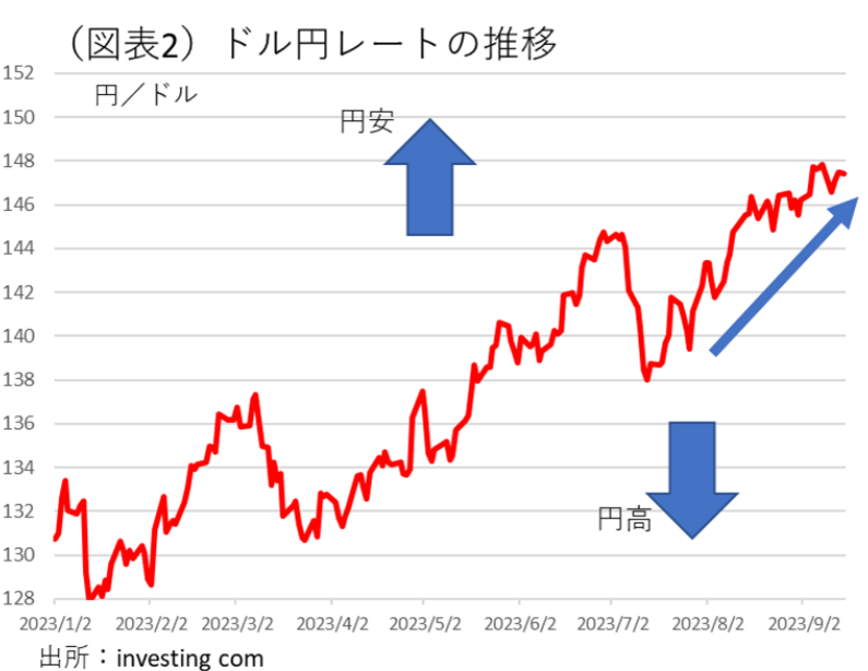 だから、植田総裁は、本気で年末利上げを考えている訳ではないとみられる。むしろ、利上げの可能性というショッキングな発言を武器にして、ドル円レートが1ドル150円に近づいていく勢いに冷水を浴びせることが狙いとみた(図表2)。つまり、円安対策として、日銀がポジション・トークを行ったというのが真意であろう。