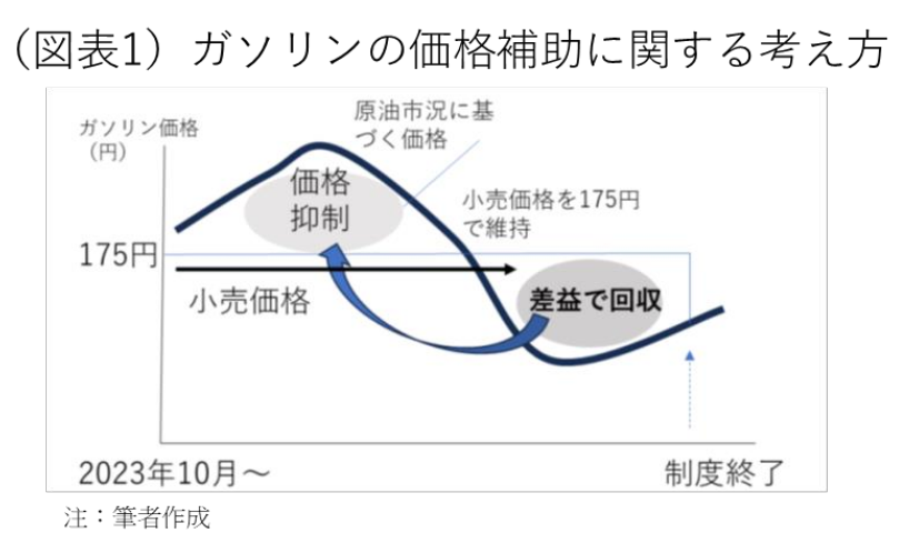 私たちは、知らず知らずのうちに、先入観や周囲の空気の影響を受けて柔軟なアイデアを思い付かなくなる。ガソリン補助金は、政治的な摩擦を心配するから止めるに止められない。選挙があるかもしれないという強迫観念が、なるべく何も変えたくないという現状維持的な思考をつくり、その発想に多くの人を巻き込んでいく。確かに、レギュラー・ガソリンは1リットル180.5円(9月25日時点)で割高だが、もしも補助金がなければ212.0円に跳ね上がる。9月末にこの補助金を廃止し、10月以降一気に212円にするのはいくら何でも厳しい。しかし、価格補助を永遠に現状維持してよい訳ではない。10~12月は枠組みを維持して、2024年以降は徐々に補助を縮小する体制に移っていく必要がある。おそらく、現行の6月から9月までの補助縮小もそうした考え方に依拠していたのだろう。2024年以降は、もっと負担増が上手に調整される仕組みを考え出す必要がある。例えば、1リットル175円に価格補助して、半年後に市況が175円以下に下がったとき、価格を維持して価格補助のコストを回収するような工夫が考えられる(図表1)。それならば、財政負担を重くしないようにできる。一時凌ぎの制度を作らないことが政策当局には求められる。