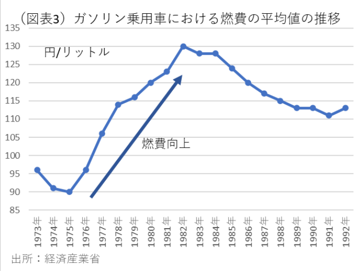 筆者は、ChatGPTだけではなく、図書館で古い資源エネルギー庁の資料も調べてみた。インターネットに載っていない情報も多く発見できた。驚いたのは、日本がオイルショックを機に、エネルギー効率を比較的に高めたというデータである。対GNP当たり一次エネルギー消費の推移である(図表2)。1973年199.5KL/億円→1983年140.2KL/億円へ約3割の省エネ化が進んだことだ。日本のエネルギー効率は、欧米、OECD平均よりも高い効率化(=省エネ化)を1973年以降に実現している。当時は、素材産業も懸命にエネルギー効率を上げ、冷蔵庫・エアコン・カラーテレビも1973年以降消費電力量が低下していった。ガソリン乗用車も、燃費が1975年から1982年にかけて1.44倍にも向上している(図表3)。筆者は、石油危機当時の記憶は定かではないが、社会全体が省エネを合い言葉に頑張っていたように思う。社会が危機感を共有し、政策当局も日本企業の競争力を念頭に置きながら政策を考えていたと思われる。