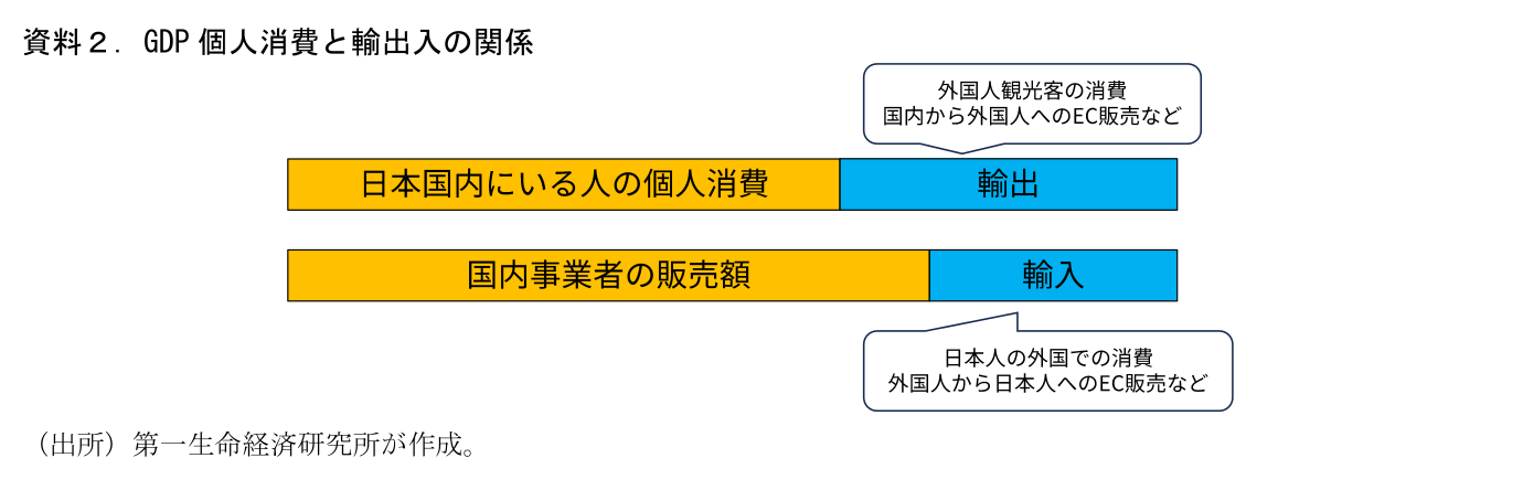 供給側統計の弱みは、「個人消費」と「輸出」の判別を誤る可能性があることだ。GDP統計の「個人消費」とは国内に住んでいる人の消費を指す。小売販売などの供給側統計には「外国人の国内での消費(インバウンド消費)」や「国内から外国人への消費財のオンライン販売」などが含まれる。また、国内に住んでいる人が消費するのは国内で供給されたものだけでなく、海外からの輸入品も含まれる。そのため、供給側の統計に輸入を加え、輸出を差し引くことで、概念的には個人消費額を求めることができることになる。