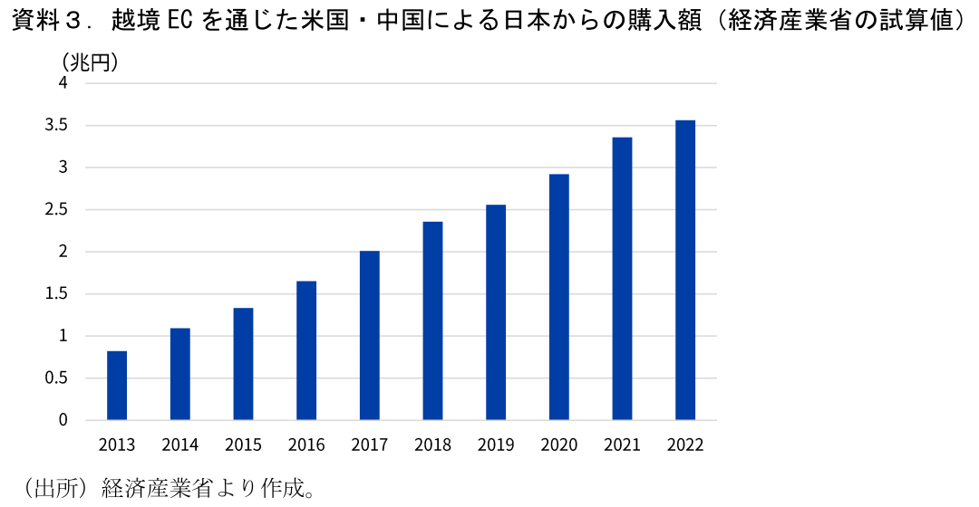 もう一つの理由は、越境EC(国境を超えたオンラインでの商取引)が増加していると考えられるためである。データがないため月次等でその動向を把握することは難しいが、経済産業省が定期的に公表している試算によれば、2022年度における米国・中国による越境ECを通じた日本からの購入額は3.5兆円を超えているとのことだ(資料3)。越境ECは世界的に成長が見込まれている分野でもある。