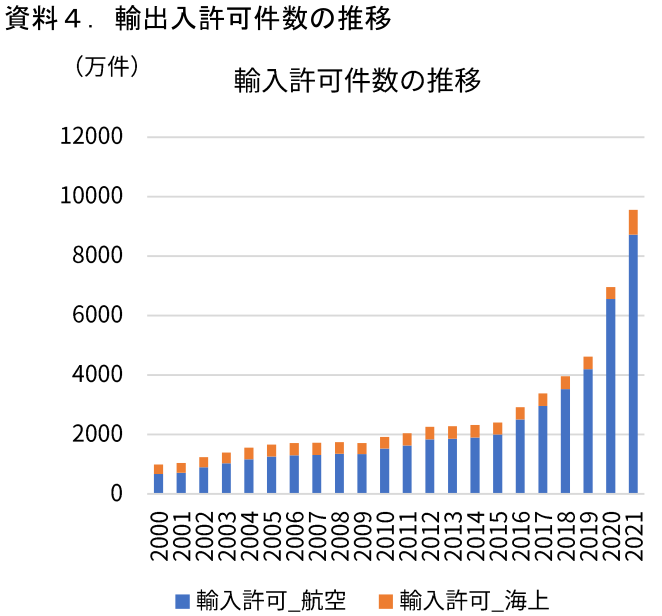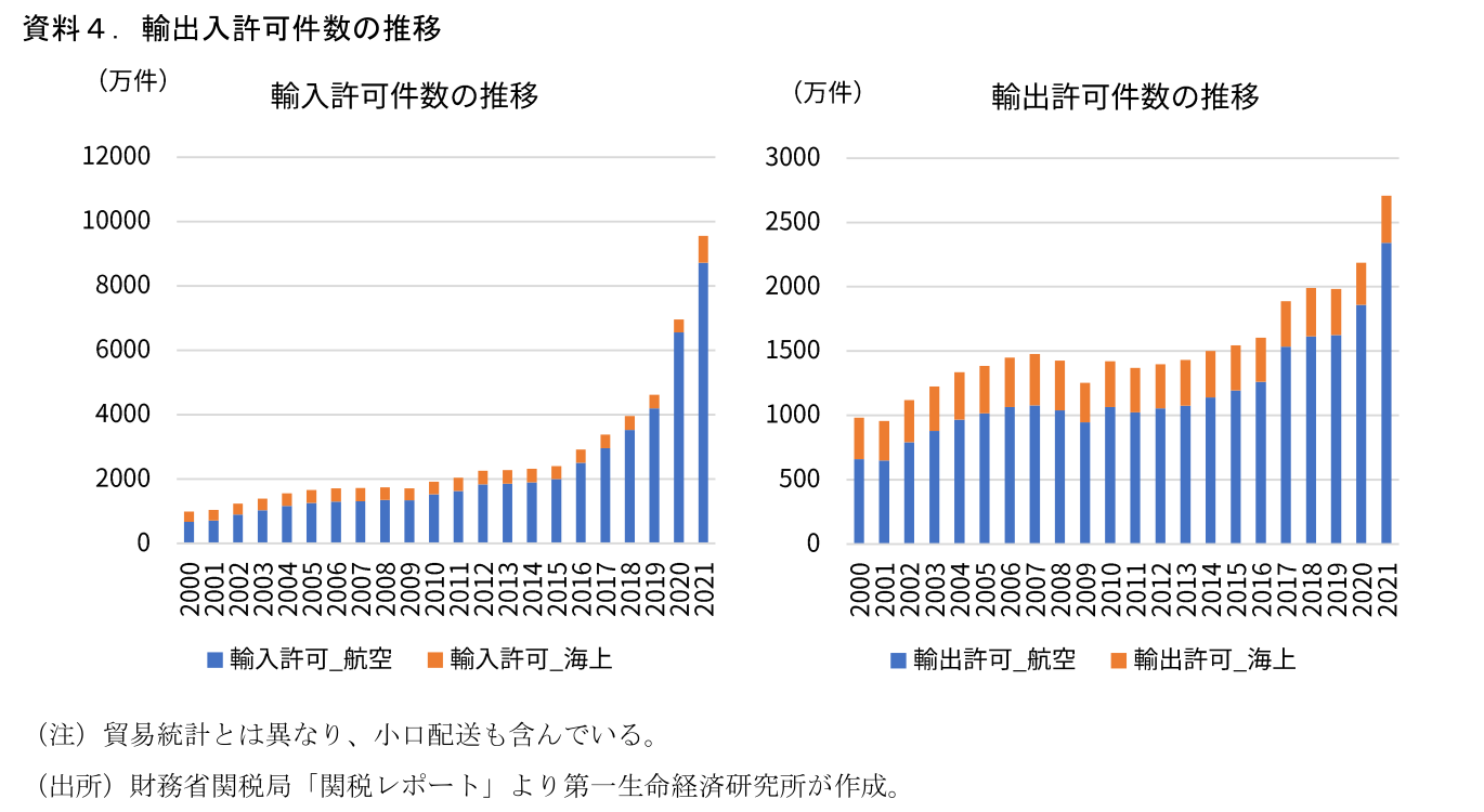 さらに、越境ECに関連したもう一つの要素が小口配送である。財務省の貿易統計(とそれをもとに作成される国際収支統計)では、20万円以下の小口配送を対象としておらず、輸出入の金額にも計上されていない。一方で、財務省の関税レポートによれば、輸出入の許可件数(小口配送含む)は2021年度にかけて急増している(資料4)。コロナ禍によって海外への渡航が難しくなったことも影響したようだ。関税局などによれば、輸入許可件数の増加の原因は航空運送を利用したSP貨物と呼ばれる小口急送貨物であり、越境EC市場の伸長が大きな要因となっている。これは輸出に関しても同様だと考えられる。関税局では急増する荷物の税関での対応等が課題となっている状況だ。