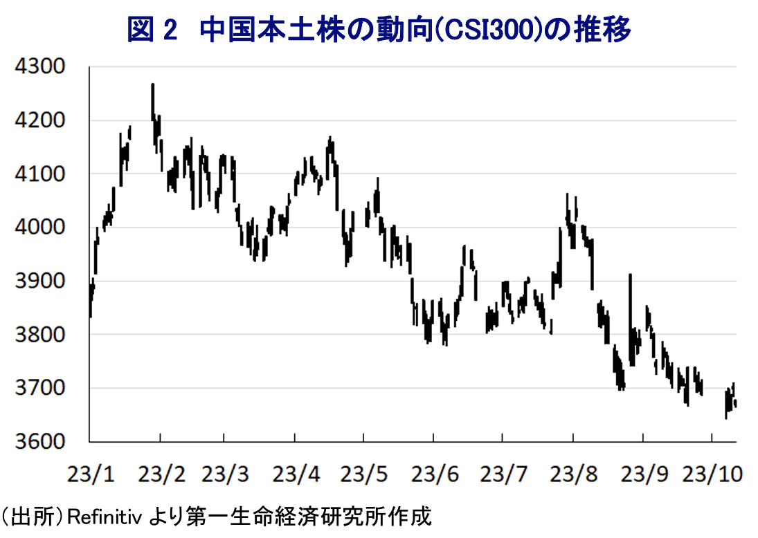 足下の世界経済を巡っては、コロナ禍からの景気回復をけん引してきた欧米など主要国が物価高と金利高の共存状態が長期化するなかで勢いに陰りが出る動きがみられるほか、昨年末以降のゼロコロナ終了にも拘らず中国経済には不透明要因が山積するなど、全体として頭打ちが懸念される状況にある。なかでも中国経済については、ゼロコロナの長期化を理由に若年層を中心とする雇用悪化が家計消費の重石となるとともに、不動産市況の低迷は家計消費のみならず、銀行セクターの貸出態度を通じて幅広く経済活動の足かせとなることが懸念される。共産党、及び政府はこのところ内需喚起に向けた取り組みを強化するとともに、中銀(中国人民銀行)も不動産セクターの支援を目的に利下げや預金準備率の引き下げなど金融緩和に舵を切る動きをみせている。さらに、不動産市況のテコ入れを目的に地方政府レベルでは融資規制や住宅購入規制の一部緩和など需要喚起策に舵を切る動きもみられるなか、足下では北京など大都市部で不動産販売が底打ちするなど変化の兆しが出ている。一方、そもそも人口減少局面入りしている上、都市化の進展も重なり供給過剰が懸念されてきた地方都市では下げ止まりの兆しがみられず、独自財源が乏しい地方政府にとって不動産関連収入が歳入面での『打ち出の小槌』となってきた状況を勘案すれば、市況低迷の長期化は歳入減を通じて財政面での景気下支えの足かせとなる懸念もくすぶる。こうしたなか、年明け直後こそゼロコロナ終了によるペントアップ・ディマンド(繰り越し需要)の発現を追い風に底入れの動きを強めたサービス業の企業マインドは、足下では一転して頭打ちの様相を強めるなど勢いに陰りが出ている。このように景気を取り巻く状況には不透明感がくすぶることを反映して、足下の株式市場は頭打ちの動きを強めているものの、こうした事態を受けて政府系ファンドが四大国有銀行の株式を買い増しする計画を公表している。過去にも、株式市場では市況の調整局面において国有銀行や政府系ファンドなどのいわゆる『国家隊』が株式を買い支えるPKOに動く流れがみられたため、当面は同様の展開が進む可能性は高まっていると判断出来る。他方、上述のように地方都市を中心に不動産市況の調整局面が続いており、多数の不動産を担保として保有する銀行セクターの収益圧迫要因となることが懸念されるほか、需要低迷が続くなかで不動産セクターにおいては資金繰り懸念が高まる動きが顕在化している。不動産セクターにおいては2年前から度々デフォルト(債務不履行)が懸念される状況が続いており、人民元建債務については『何らかの形で』債権者から債務再編に関する合意を得る動きがみられる一方、外貨建債務については合意に至らずデフォルトに陥る動きが散見される。このように、足下の状況は事態打開にはほど遠いものの、当面は当局による政策対応の強化を通じて『時間稼ぎ』を図る展開が続くと予想される。ただし、中国はコロナ禍を経て人口減少局面入りしている上、当局によるゼロコロナの長期化を受けて若年層の間にはいわゆる『躺平(タンピン:寝そべり族)』が拡大して消費行動パターンが大きく変化する動きもみられるなか、中国経済が世界経済のけん引役となってきた状況は大転換を迎えつつあると捉えられる。