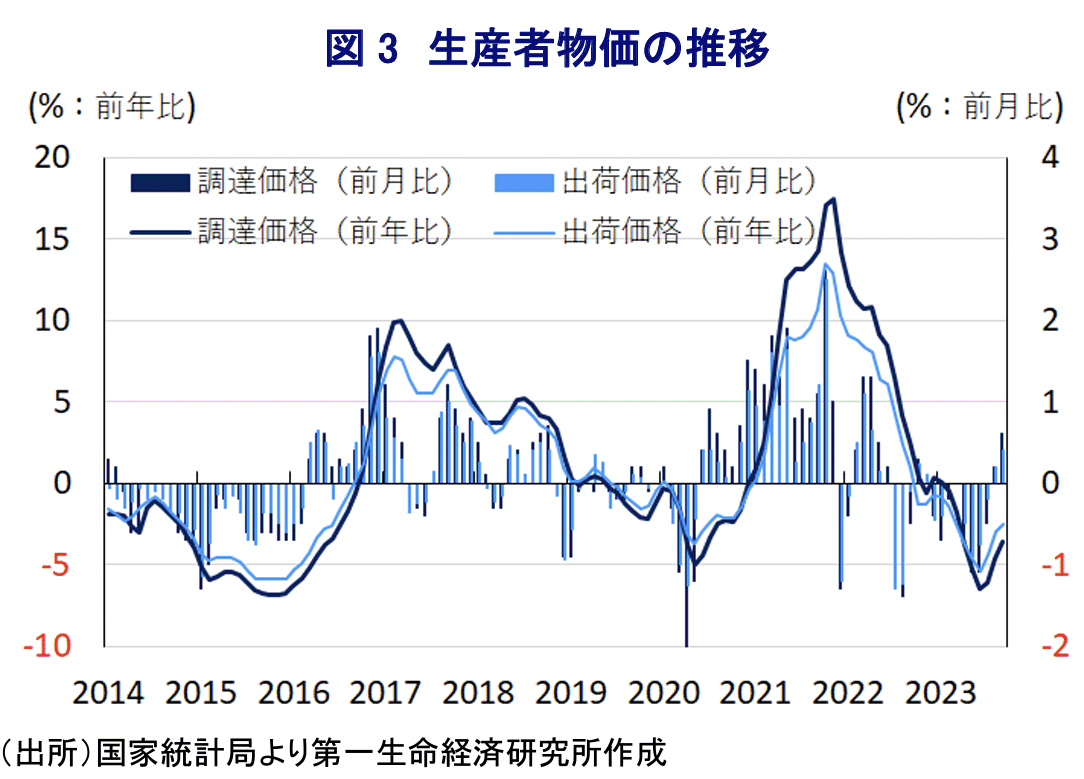 世界的には昨年来の商品高を受けてインフレが懸念されたなか、中国においても企業部門を中心にインフレ圧力が強まる事態に直面するも、当局がインフレを警戒して企業に対してコスト上昇分を製品価格に転嫁することを事実上禁止したため、消費者物価については他国と比較して落ち着いた推移が続いた。さらに、ロシアによるウクライナ侵攻を機に欧米などはロシアに対する経済制裁を強化する対応をみせたものの、中国は割安な価格でロシア産原油や天然ガスの輸入を拡大させるなどインフレ圧力の緩和に向けた取り組みを進めた。他方、昨年末以降における商品高の一服に加え、年明け以降は世界経済の減速懸念を理由に商品市況が調整の動きを強めたため、川上の企業部門においては一転してデフレ圧力が強まった。そして、上述のように雇用悪化により家計部門の財布の紐が固くなっていることに加え、不動産市況の低迷による資産デフレの動きが逆資産効果を通じて幅広い経済活動の足かせとなっていることも重なり、中国経済全体としてデフレが意識される事態を招いている。なお、足下では主要産油国による自主減産延長に加え、異常気象の頻発による農業生産の低迷を受けて農産品の輸出禁止、制限に動く国が広がりをみせるなかで商品市況は底入れの動きを強めており、企業部門を中心にインフレが再燃する兆しが出ている。こうした状況を反映して、9月の生産者物価(調達価格)は前年比▲3.6%と8ヶ月連続のマイナスとなるも前月(同▲4.6%)からマイナス幅は縮小しており、商品市況の底入れに伴う原材料価格の上振れの動きを受けて前月比も+0.6%と前月(同+0.2%)から2ヶ月連続で上昇している。さらに、原材料の価格上昇の動きは中間財を中心に価格転嫁が進んでいることを反映して、9月の生産者物価(出荷価格)も前年比▲2.5%と12ヶ月連続のマイナスとなるも前月(同▲3.0%)からマイナス幅は縮小しており、前月比も+0.4%と前月(同+0.2%)から2ヶ月連続で上昇している。ただし、家計消費の低迷やEC(電子商取引)サイト間の価格競争激化の動きも影響して消費財への価格転嫁は困難な状況が続いている模様であり、上述のように原材料価格の上昇にも拘らず耐久消費財の価格は横這いで推移するなど、物価上昇圧力が高まりにくい状況が続いている。このような川上から川下への価格転嫁が進みにくい状況を受けて、9月の消費者物価は前年比+0.0%と前月(同+0.1%)から伸びが鈍化しているものの、前月比は+0.2%と前月(同+0.3%)から上昇ペースは鈍化するも3ヶ月連続で上昇している。ただし、生鮮品を中心とする食料品やエネルギーなど生活必需品に物価上昇圧力が強まる動きがみられるなか、これらを除いたコアインフレ率は前年比+0.8%と前月(同+0.8%)と同じ伸びに留まり、前月比も+0.1%と前月(同+0.0%)からわずかな上昇に留まる。日用品などで物価上昇圧力が強まる一方、雇用調整圧力がくすぶる状況を反映してサービス物価に下押し圧力が掛かる動きがみられるなど、当局による内需喚起策にも拘らずデフレ懸念が払しょく出来ない状況が続いていると捉えられる。