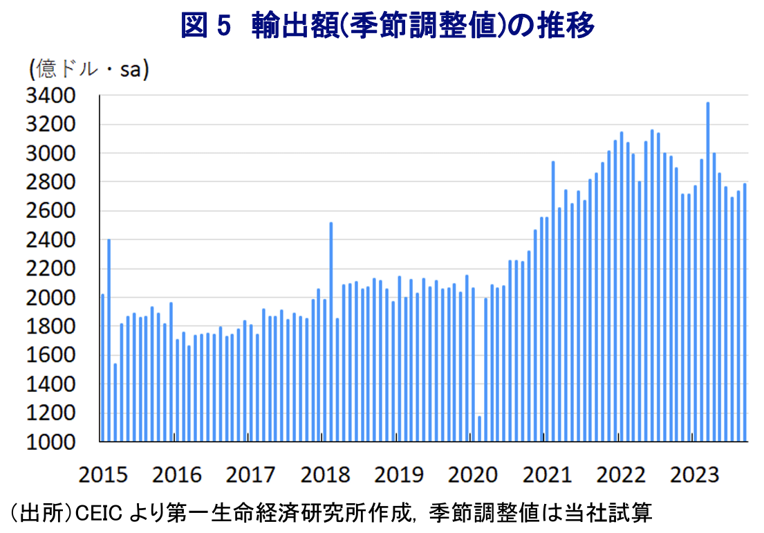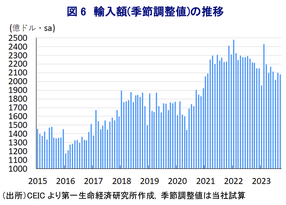 - 米中摩擦や世界的なデリスキングを目指したサプライチェーン見直しの動き、世界経済の減速懸念が外需の重石となってきた。しかし、9月の輸出額には底打ちの兆しがうかがえるが、依然力強さに乏しく世界経済を巡る状況が足かせとなり得る。輸入額は内需の弱さを反映して頭打ちの状況が続いており、ビジネス環境の悪化も足かせとなっている。当面の内・外需はともに難しい環境が続く懸念がくすぶると捉えられる。