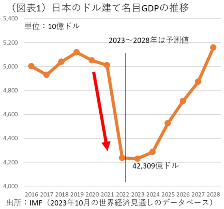 この構図を1国全体でみるとどうなるだろうか。日本全体が割安になっているということだ。IMFが公表している世界経済見通しのデータベースでは、2023年10月の見通しでは、2023年の日本の名目GDP(経済規模)はドル建てで42,309億ドルとなっている(図表1)。2023年には、名目GDPの値がドイツの44,298億ドルを下回っている。IMFは、日独逆転が2023年中に起こると予想しているのだ。その後、日本は2026年にはインドに抜かれる可能性もある。