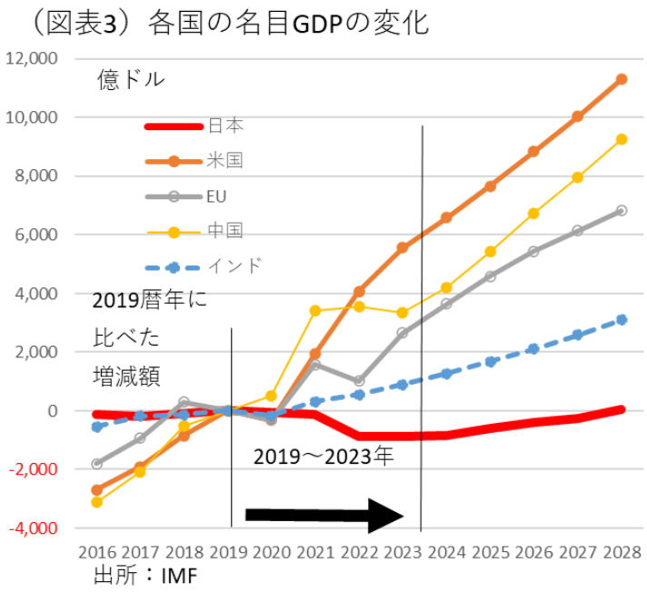 米国との比較をした上で、米国の名目成長が突出しているとは言え、そうでもない。米国は、2019年→2023年の名目GDPが1.26倍になった。この期間に中国は1.23倍、インドは1.32倍、EUは1.17倍になっている。日本は▲17.3%だから例外的に小さくなっていることがわかる(図表3)。