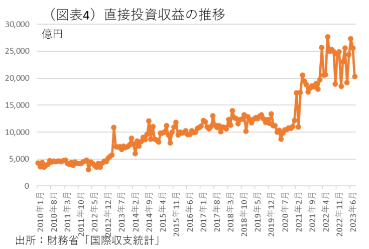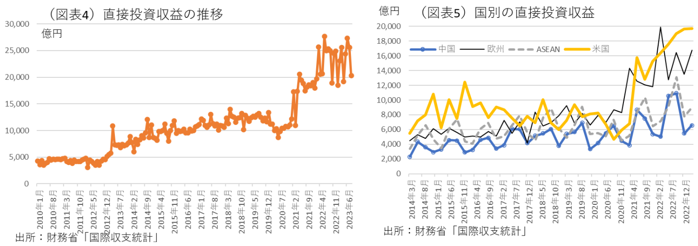 では、こうした結果が何をもたらすのだろうか。様々な解釈ができると思うが、筆者は日本企業の投資行動を変化させていることに注目する。前向きに言えば、企業が海外で稼ぐ姿勢を強めるということだ。大企業・中堅企業は利益を増やすために、投下する資本を国内・海外に振り分けているが、その資金を国内から海外にシフトさせている。海外向けの投融資の増加である。例えば、持ち株会社であった場合は、海外事業を拡充する志向を強めて、逆に国内事業は相対的に縮小させていく。より収益が見込める地域、例えば米国、欧州、インド、中国などを重視して投融資を増やしていく。財務省「国際収支統計」の直接投資収益の内訳を調べると、全体的に増加していて、国別には米国と欧州の収益がここにきて増えている(図表4、5)。そうした地域に投資をシフトさせることが、合理的に考える企業にとって、株主に支払う分配資金を増やすことになる。