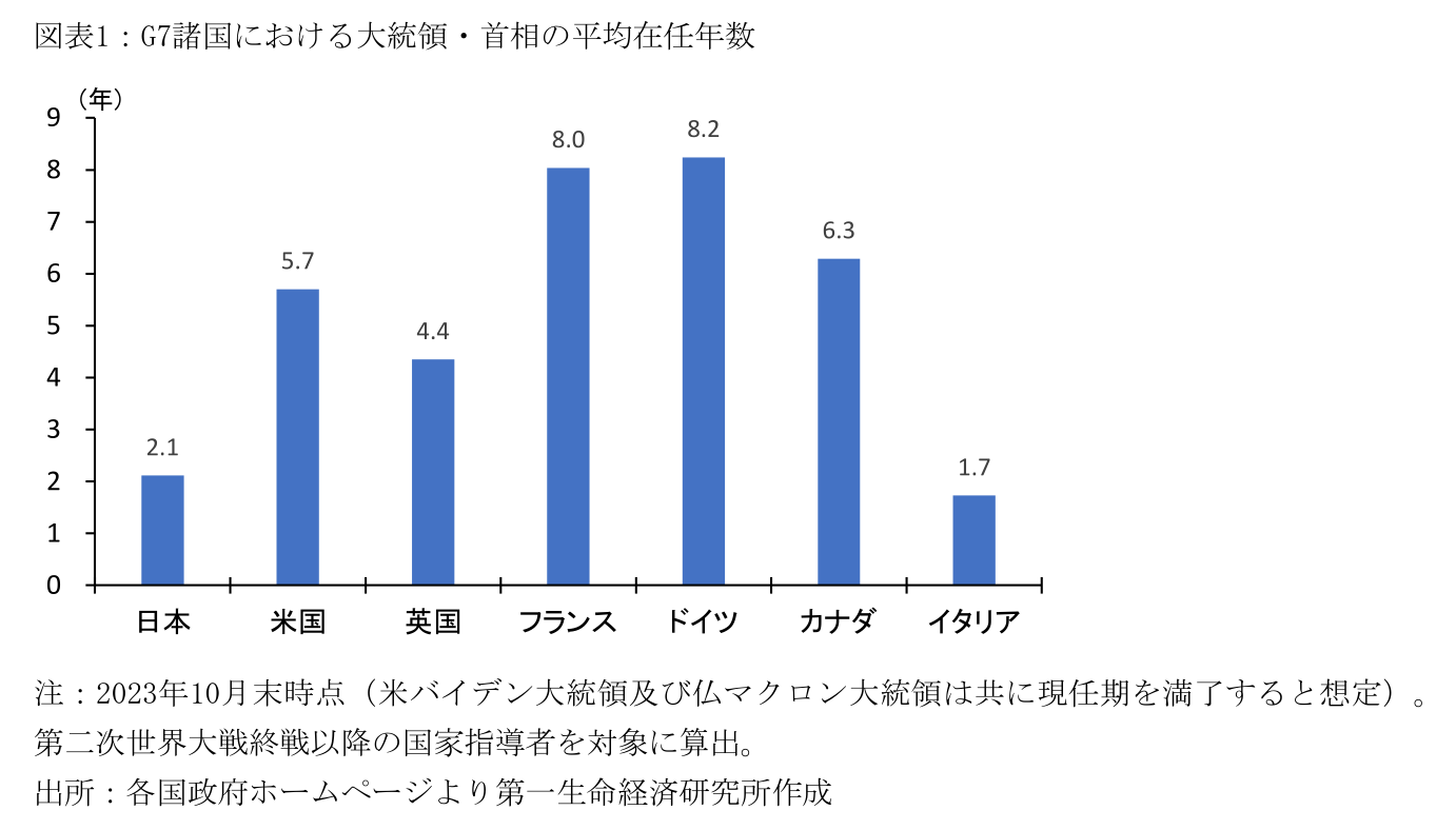 とはいえ、リーダーがマクロ経済に及ぼす影響を期待し過ぎることには注意が必要かもしれない。そもそも上記の研究を含め、リーダーとマクロ経済の関係性を分析する際に、世界経済の動向や一国の景気循環などリーダー以外の経済的要因をコントロールするのは容易なことではない(注4)。長期的な経済発展の決定要素を巡っては、文化や組織、地理的条件、或いは遺伝などの様々な要因を指摘する研究が存在する(注5)。G7諸国におけるリーダーの平均在任年数は、日本やイタリアでは約2年、その他の国では5-8年程度であり(図表1)、こうした任期で一国の様々な経済的・社会的要因を変化させるのは難しい。加えて、民主主義国家における立法権は主に議会にあり、リーダーによる政策決定は与党内、或いは与野党のパワーバランスによる制約を受けることが多い。