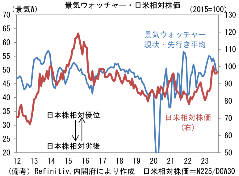景気ウォッチャー調査は速報性に優れていながら、予測精度が高いことが知られておりGDP(在庫を除いた「最終需要」)との連動性が認められている他、株価についても一定の関係が確認できる。単純に株価水準の変化と一定の連動性を有している他、景気ウォッチャーが改善傾向にある時、日本株は米国を上回る勢いで上昇するという関係が見て取れる。株価が景気ウォッチャーに影響を与えているという因果の向きの存在は否定できないが、それでも景気ウォッチャー低下基調を強めていることは日本株の不気味な兆候として認識しておくべきであろう。