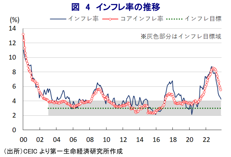 メキシコ中銀は、9日に開催した定例会合において政策金利を5会合連続で11.25%に据え置く決定を行った。同国においては、一昨年以降の商品高に加え、コロナ禍一服による経済活動の正常化、隣国である米国経済の回復を追い風に景気の底入れが進んだことも重なり、インフレが大きく上振れしてきた。他方、国際金融市場では米FRB(連邦準備制度理事会)によるタカ派傾斜を反映した米ドル高圧力が強まる動きがみられたものの、メキシコ中銀は米FRBに歩を併せる形でタカ派傾斜を強めたため、通貨ペソ相場は比較的堅調な推移をみせるなど他の多くの新興国通貨と異なる動きをみせてきた。さらに、昨年末以降は商品高や米ドル高の動きが一巡するなどインフレ要因が後退したため、一時は12年弱ぶりの水準となったインフレは頭打ちに転じており、年明け以降は頭打ちの動きを強める展開が続いている。このところの中南米諸国においては、インフレ鈍化を理由にウルグアイ、チリ、ブラジル、ペルーが相次いで利下げに動く『利下げドミノ』とも呼べる動きが広がりをみせているほか、米FRBもタカ派姿勢を幾分後退させる動きをみせる。こうした状況ながら、メキシコ中銀はインフレが依然として中銀目標を上回る推移が続いていることを理由に、今年5月に2年に及んだ利上げ局面を休止させるも、その後は金利を据え置くなどタカ派姿勢を維持してきた。他方、インフレ鈍化に伴い実質金利のプラス幅が拡大するなど投資妙味が向上したことで資金流入が活発化してペソ高の動きが進んだものの、同国経済は財輸出の約8割、GDPの約4%に相当する移民送金の大宗を米国に依存しており、ペソ高は価格競争力を低下させるほか、移民送金のペソ建換算値を下押しするなど、景気の足を引っ張ることが懸念される(注1)。こうしたことから、中銀は9月以降にペソ相場の安定を目的に実施してきた為替ヘッジプログラムの段階的な縮小に動いており、それ以降のペソ相場は一転して頭打ちの動きを強めていることを反映して移民送金のペソ建換算値が押し上げられているほか、価格競争力の低下に歯止めが掛かっているとみられる。そして、世界経済を巡る不透明感が高まっていることに加え、ペソ高による景気への悪影響が懸念される状況が続いたものの、7-9月の実質GDP成長率(速報値)は前期比年率+3.69%と前期(同+3.40%)からわずかに伸びが加速するなど底入れの動きが続いている様子が確認されている。他方、このところは主要産油国による自主減産延長に加え、中東情勢を巡る不透明感が強まる動きがみられる一方、異常気象の頻発を受けた農作物の生育不良を理由に輸出禁止や制限に動く国が広がりをみせており、食料品やエネルギーなど生活必需品を中心にインフレが再燃する懸念が高まっている。こうした状況ながら、足下のインフレ率は一段と頭打ちの動きを強める展開が続いて中銀目標の上限に近付くなど、実質金利のプラス幅は一段と拡大して投資妙味が向上しており、上述した為替ヘッジプログラムの縮小にも拘らずペソ相場は底堅い動きをみせている。こうしたことから、中銀は9日の定例会合において5会合連続で金利を据え置く決定を行う一方、会合後に公表した声明文ではインフレ見通しについて「ディスインフレプロセスの進展を評価するも、見通しは依然として厳しい」との見方を示した上で、金利据え置きを決定したとしている。その上で、先行きの政策運営について「インフレ圧力とインフレ期待に与える影響を徹底して監視する」としつつ、「インフレ率を目標域に持続的に収束させるべく、政策金利を『しばらくの間(for some time)』現行水準に維持する必要がある」としており、前回会合までの『長期間に亘って(for an extended period)』から表現を修正するなど幾分タカ派姿勢を後退させている様子がうかがえる。なお、直近のインフレ見通しにおいてはインフレ率が目標域に収束するのは来年4-6月と変更していないものの、当面のインフレ見通しを下方修正しており、足下におけるインフレ鈍化の動きを好感しているとみられる。よって、先行きについては周辺国同様に金融緩和サイクルの開始を検討し始めているものと見込まれるものの、当面のペソ相場については実質金利のプラス幅の大きさを追い風に引き続き底堅い展開が続くと予想される。