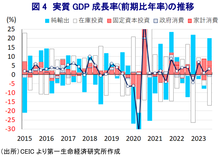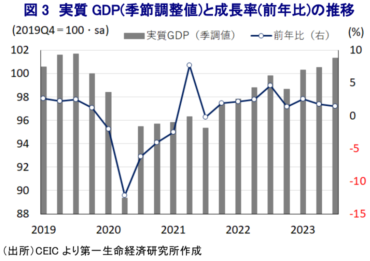 上述のように、年明け以降の景気は国内外における環境改善を追い風にした底入れが期待されたものの、力強さを欠く展開が続くなど本調子にほど遠い状況にある。7-9月の実質GDP成長率は前期比年率+3.10%と3四半期連続のプラス成長で推移しており、前期(同+0.90%)から伸びが加速するなど底入れ動きを強めていることが確認されているものの、中期的な基調を示す前年同期比ベースの成長率は+1.5%と前期(同+1.8%)から伸びが鈍化するなど、依然として勢いの乏しい状況が続いている。需要項目別では、世界経済の減速懸念の高まりを反映して財輸出は勢いを欠く展開が続いているほか、国境再開による外国人観光客数の底入れの動きも一服してサービス輸出に下押し圧力が掛かるなど、総じて輸出は低調な推移が続いている。一方、インフレ鈍化を受けた実質購買力の押し上げも追い風に家計消費は堅調な動きをみせているほか、ここ数年の米中摩擦の激化やデリスキング(リスク低減)を目的とするサプライチェーン見直しの動きも追い風に企業部門による設備投資も比較的堅調な動きをみせるなど、民間需要を中心に内需は底堅く推移している。ただし、総選挙後の政治空白の長期化を反映して政府消費は大きく下振れするとともに、公共投資の進捗の遅延を受けて公的部門による固定資本投資も下振れしており、こうした動きが輸入を下押ししている。結果、純輸出(輸出-輸入)の成長率寄与度は前期比年率ベースで+12.21ptと成長率を大きく上回る水準となる一方、在庫投資による成長率寄与度は▲15.74ptと在庫調整の動きが大きく進んでいる様子もうかがえる。なお、分野別の生産動向を巡っても、商品市況が底入れの動きを強めたことを反映して鉱業部門の生産が大きく上振れしているほか、家計消費や外国人来訪者数の底入れの動きを反映してサービス業の生産も堅調な推移をみせている。その一方、公共投資の低迷を受けて建設業の生産は下振れしている上、外需を巡る不透明感の高まりを反映して製造業の生産は減速の動きを強めており、同国経済を取り巻く状況は厳しさを増しているものと捉えられる。よって、一見すれば足下の景気は底入れの動きを強めているようにみえるものの、その内容については不透明なところが少なくないのが実態である。