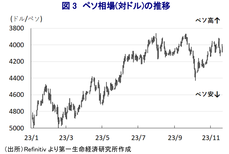 南米のコロンビアにおいては、昨年の大統領選において左派のグスタボ・ペトロ氏が勝利したことで同国初となる左派政権が誕生するなど、ここ数年中南米諸国に広がりをみせる『ピンクの潮流』と呼ばれる動きが伝統的に米国と関係が深い同国にも及んだ格好である。こうした背景には、コロナ禍を経て同国経済が疲弊するなか、ここ数年の商品高に伴うインフレが国民生活を直撃する状況に直面するなか、ペトロ氏が公約に掲げた社会経済格差の解消を目指す動きをみせたことが国民を惹き付けたとみられる。また、同国においては長年に亘る内戦の後に左派ゲリラ勢力との和平合意を経て治安改善が図られているものの、武装組織が存在するなかでペトロ氏は最大の武装組織であるELN(民族解放軍)との和平交渉再開を公約に掲げ、このことも支持を後押しした。なお、和平交渉は一進一退の動きをみせるも今年6月に一時停戦で合意しており、8月から停戦が実施されるなど前進する動きがみられる。他方、ペトロ政権は昨年の発足から保険制度や労働制度、年金制度などで矢継ぎ早に改革案を打ち出すも、共和国議会では当初こそ上院(元老院)、下院(代議院)ともに政権を支える左派勢力が中道政党と連立を組む形で多数派を形成したものの、路線対立の表面化を理由に中道政党が離反する動きが広がりとん挫する展開が続いてきた。さらに、政権内ではペトロ氏の側近によるスキャンダルが相次いで発覚するとともに、今年7月には資金洗浄容疑でペトロ氏の長男と元妻を逮捕する事態に発展しており、和平交渉の背後で洗浄された資金がペトロ氏の政治資金に使用されたとの疑惑も噴出している(注1)。また、昨年は商品高や国際金融市場における米ドル高に加え、同国は電力構成の6割以上を水力発電に依存するなかでここ数年の歴史的大干ばつを理由に火力発電の再稼働を余儀なくされる事態も重なりインフレが上振れしてきた。なお、昨年末にかけては商品高や米ドル高が一巡するなどインフレ要因が後退しており、多くの中南米諸国においてはインフレが頭打ちに転じる動きがみられるものの、同国では年明け以降もインフレ加速が続いて中銀は利上げを余儀なくされてきた(注2)。足下のインフレは頭打ちに転じるも直近10月も前年比+10.5%と中銀目標(3±1%)を大きく上回る推移が続いており、中南米諸国ではインフレ鈍化を受けて利下げに動く流れがみられるものの、中銀は引き締め姿勢の維持による様子見を図る状況が続いている。このように物価高と金利高の共存状態が長期化していることを受けて、7-9月の実質GDP成長率は前期比年率+0.96%と前期(同▲3.89%)から2四半期ぶりのプラス成長に転じるも勢いを欠く推移が続いており、中期的な基調を示す前年同期比ベースでは▲0.3%と3年弱ぶりのマイナス成長に転じるなど頭打ちの様相を強めている。こうしたことから、発足直後における政権支持率はまずまずの出だしをみせたものの、構造改革が相次いでとん挫していることに加え、スキャンダルの続出も追い風に支持率は低迷に歯止めが掛からない状況が続いており、政権発足から1年強にも拘らず極めて厳しい状況に追い込まれている。このように政局や経済を巡る状況には不透明感が高まっているものの、主要産油国による自主減産延長決定や中東情勢を巡る不透明感の高まりを受けた原油価格の底入れの動きに加え、インフレが頭打ちに転じて実質金利のプラス幅が拡大するなど投資妙味の向上も追い風に通貨ペソ相場は底入れの動きを強める展開をみせてきた。足下では世界経済の減速懸念の高まりなどを理由に原油相場は頭打ちに転じる動きをみせているものの、ペソ相場は底堅い動きをみせており、足下では米ドル高圧力が後退していることに加え、政権を取り巻く環境が厳しさを増すなかで左派志向の強い改革機運が後退することを期待する向きも影響しているものと捉えられる。とはいえ、経済も政治もともに不透明な状況が続くなかで外部環境如何により大きく動揺する可能性に注意する必要がある。