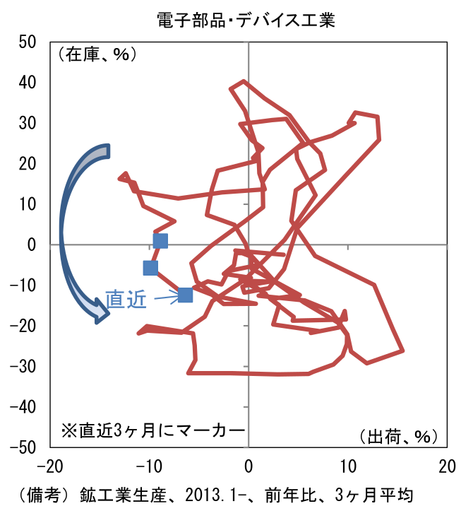 - 電子部品・デバイス工業は10月に出荷のマイナス幅が▲3.4%(9月は▲8.5%)へと縮小し、在庫も▲15.6%(9月は▲20.1%)と減少が続いたことから、出荷・在庫バランス(両者の前年比差分から算出)は+12.3%と2ヶ月連続でプラス圏推移し、3ヶ月平均でも+6.1%とプラス圏に浮上した。3ヶ月平均値がプラス圏に浮上したのは25ヶ月ぶりであり潮目の変化を象徴する。在庫循環図の位置取りは、左下領域(在庫減・出荷減)を右下方向(在庫減・出荷増)に進路をとっており、今後、右下領域に移行するその過程において景況感好転が期待される。