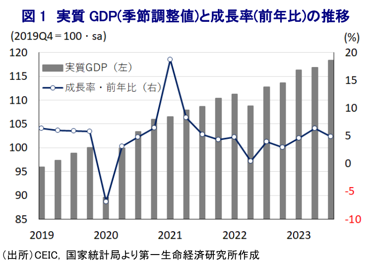 - 足下の中国経済は供給サイドを中心に景気の底入れが進む一方、需要サイドでは内・外需双方に懸念要因が山積する状況が続く。今年の経済成長率を巡っては、政府目標(5%前後)は射程圏内にあると判断出来る一方、需要の弱さを反映してデフレ懸念が高まるなか、当局による需要喚起策も充分ではない。来年の経済成長率は鈍化が避けられない上、一段と下振れするリスクもくすぶる状況にあると判断できる。