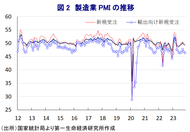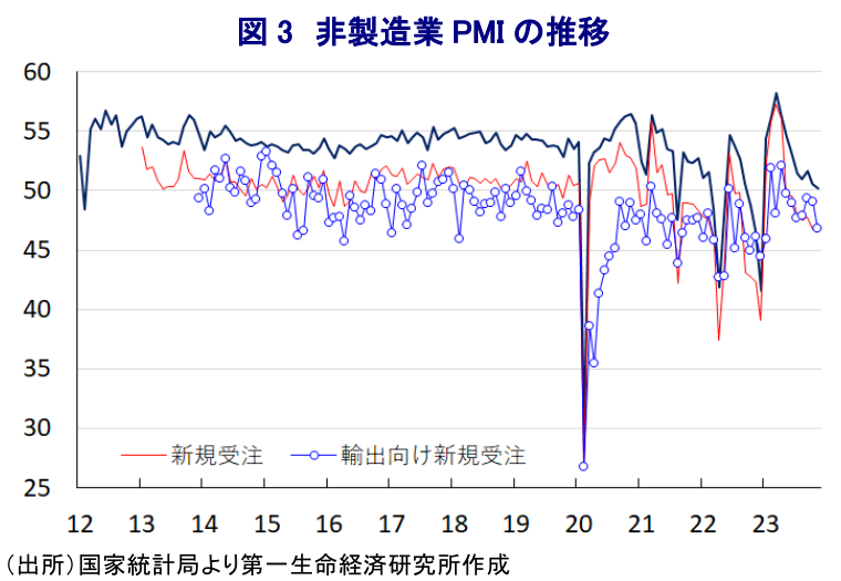 - 過去数ヶ月に亘って企業マインドは頭打ちの動きが続くなか、11月の製造業PMIは49.4と一段と低下して50を下回る推移が続く。内・外需双方に下振れ懸念がくすぶる上、内需喚起策の効果が一部に留まる動きもみられる。11月の非製造業PMIも50.2に低下しており、内需喚起策の影響で建設業(55.0)は底打ちする一方、サービス業(49.3)は50を下回るなど深刻な状況に陥っている。サービス業では跛行色が一段と鮮明になっており、不動産市況の低迷や地方政府債務を巡る問題などが足かせとなっているとみられる。