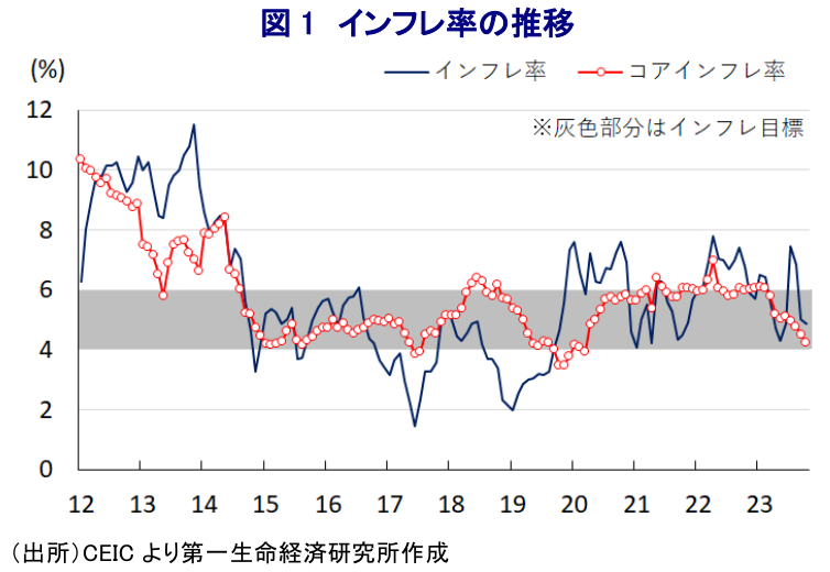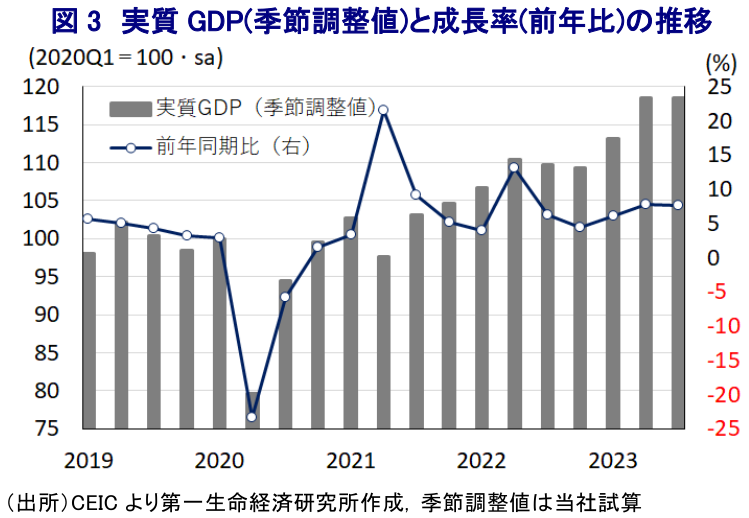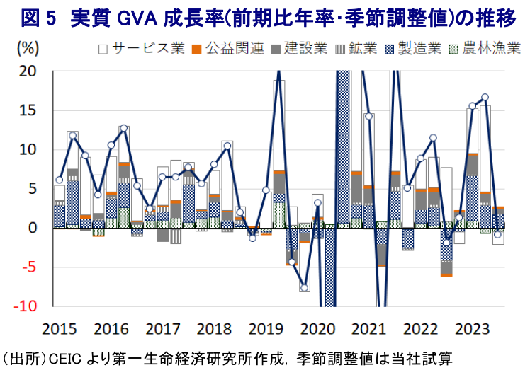 - 年明け以降のインフレ鈍化や中銀の利上げ休止を受けて景気は底入れしており、インフレ圧力がくすぶるも7-9月の実質GDP成長率は前年比+7.6%と高い伸びが続く。ただし、これは前年末にかけて景気が頭打ちした反動が影響しており、前期比年率ベースの成長率ではマイナス成長と試算されるなど足踏みしていると捉えられる。外需は堅調な動きをみせるほか、公共投資の進捗も景気を下支えする一方、インフレ再燃や金利高は民間需要の足かせとなっている。分野別の生産も少雨が農林漁業の生産の重石となっている上、内需の弱さを反映してサービス業の生産も弱含むなど、前年比データとは「異なる顔」がみえてくる。