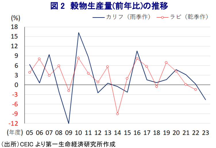 昨年のインドにおいては、コロナ禍の一巡を受けた経済活動の正常化が進むなか、商品高と国際金融市場における米ドル高を受けた通貨ルピー安による輸入インフレが重なり、インフレが大きく上振れする動きが顕在化した。また、インドは国内における原油消費量の約7割を中東など海外からの輸入に依存しており、原油価格の上昇はインフレのみならず、輸入増を通じて対外収支を悪化させるなど経済のファンダメンタルズ(基礎的条件)の脆弱性を連想させる。さらに、対外収支の悪化を警戒した資金流出の動きはルピー安を通じて輸入インフレを増幅させてインフレの上振れを招くといった悪循環に繋がることが懸念される。なお、中銀(インド準備銀行)はコロナ禍対応を目的に、利下げに加えて事実上の財政ファイナンスに動くなど異例の金融緩和に舵を切る動きをみせてきたものの、こうした事態を受けて昨年5月に一転して緊急利上げに動いたほか、その後も物価と為替の安定を目的に断続利上げを余儀なくされた。結果、昨年末にかけての同国経済は前年同期比ベースではプラス成長を維持するも、季節調整値に基づく前期比年率ベースでは2四半期連続のマイナス成長に陥るテクニカル・リセッションに陥ったと試算されるなど景気は頭打ちした(注1)。他方、昨年末以降は商品高と米ドル高の動きが一巡するなどインフレ要因が後退したほか、こうした状況を反映して年明け以降のインフレは一旦頭打ちの動きを強めるとともに、中銀目標の域内で推移するなど落ち着きを取り戻す動きがみられた。よって、中銀は今年4月に1年弱に及んだ利上げ局面の休止に動くとともに、その後も10月の定例会合まで4会合連続で金利を据え置くなど景気下支えに傾く動きをみせている。しかし、今年はモンスーン(雨季)の雨量が8年ぶりの低水準に留まるなど穀物などのカリフ(雨季作)の生産量は大きく下振れしており、供給懸念を理由に価格が上振れするなどインフレ圧力が強まる動きがみられる。同国では来年に総選挙(連邦議会下院選挙)が予定されており、モディ首相や与党BJP(インド人民党)は選挙後の政権3期目入りを確実にすべく物価抑制を至上命題とする動きをみせており、最高級品種以外のすべての白米を輸出禁止としたほか、タマネギに対して高い輸出関税を課すなど国内供給を優先する姿勢をみせている。世界最大のコメ輸出国である同国による禁輸は国際価格の上昇を招くとともに、コメを主食とするアジア新興国の食料インフレを招くなどの悪影響を招いている。ただし、モディ政権によるこうした姿勢は、コロナ禍の最中に世界最大のワクチン生産国である同国が国内供給を優先する動きをみせたのと同様と捉えられる。さらに、昨年からのロシアによるウクライナ侵攻を巡っては、欧米などがロシアに対する経済制裁を強化させるも、同国は原油高による悪影響を緩和させるべくロシア産原油の輸入を拡大させるなど実質的にロシアを支えるなど『実利優先』の姿勢をみせる(注2)。今後はラビ(乾季作)の下振れも予想されることで食料インフレが長引く懸念もくすぶるため、モディ政権が総選挙を見据えて一段と物価抑制に向けた策を講じる可能性に注意が必要と考えられる。