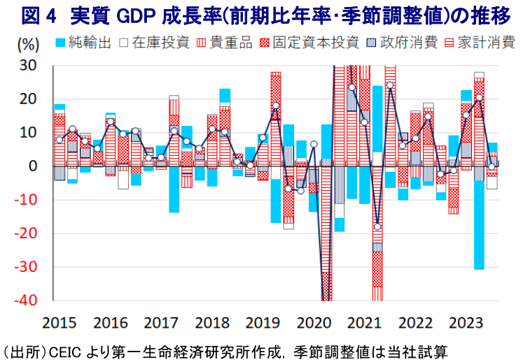 なお、年明け以降のインフレ鈍化による実質購買力の押し上げのほか、こうした動きを受けて中銀が利上げ局面の休止に動いたことに加え、ここ数年の米中摩擦やデリスキング(リスク低減)を目的とするサプライチェーン見直しの動きも追い風に、上述のように昨年末にかけての同国景気はテクニカル・リセッションに陥るなど頭打ちの動きを強めたものの、年明け以降については一転して底入れの確認されてきた(注3)。しかし、足下においては穀物や生鮮食料品をはじめとする食料インフレの動きが再燃するとともに、国際金融市場においては米ドル高の動きが一服しているにも拘らずルピーの対ドル相場は最安値圏で推移するなど輸入インフレ圧力が掛かりやすい展開が続くなど、家計消費に冷や水を浴びせる材料は山積している。こうしたなか、7-9月の実質GDP成長率は前年同期比+7.6%と前期(同+7.8%)から伸びが鈍化するも2四半期連続で7%を上回る高い伸びが続いており、一見すれば足下のインド景気は堅調な推移をみせている様子がうかがえる。しかし、上述したように昨年末にかけてはテクニカル・リセッションに陥ったと試算されるなど景気は頭打ちの様相を強めたとみられるなか、今年についてはその反動で前年同期比ベースの成長率は上振れしやすい環境であることに注意する必要がある。事実、季節調整値に基づく前期比年率ベースの成長率を試算すると、7-9月はわずかながらマイナス成長になったと捉えられるなど、年明け以降に底入れの動きを強めてきた景気が『足踏み』しているものと捉えられる。需要項目別では、世界経済の減速懸念にも拘らず財輸出に底堅さがうかがえるほか、世界的な人の移動の活発化も追い風に外国人来訪者数も底入れしており、財・サービス両面で輸出が押し上げられる動きがみられる。また、来年の総選挙を見据えた景気下支えを目的とするインフラ投資の進捗の動きを反映して政府消費が大きく上振れしているほか、固定資本投資も下支えされる展開が続いている。一方、インフレ再燃による実質購買力の下押しに加え、昨年来の中銀による利上げの累積効果も重なり、底入れの動きが続いた家計消費の動きに一服感が出ているほか、対内直接投資は堅調な流入が続いているものの、企業の設備投資の動きも一服している様子がうかがえる。なお、家計消費に一服感が出る動きがみられる一方、奢侈財に対する需要が大幅に拡大する動きが確認されており、足下において金をはじめとする宝飾品に対する輸入が拡大している動きと一致するなど需要の根強さが影響しているとみられる。ただし、在庫投資の成長率寄与度は4四半期ぶりのマイナスになったと試算されるなど、在庫調整が進んでいる様子がうかがえる。他方、供給サイドの統計である実質GVA成長率も前年同期比+7.4%と前期(同+7.8%)から鈍化するも高い伸びが続いている様子がうかがえるも、前期比年率ベースではマイナス成長になったと試算されるなど、需給双方で足下の景気は足踏みしていることは間違いない。外需の堅調さを反映して製造業や鉱業の生産は堅調に推移しているほか、公共投資の進捗の動きは建設業を下支えする一方、農林漁業関連の生産低迷の動きが景気の足を引っ張っている上、家計消費の一服感を受けてサービス業の生産も弱含んでいる。よって、インド政府が公表する前年比ベースでは需給双方で高い伸びが示されるなど、足下の景気は堅調に推移しているようにみえるものの、その実態を把握することを難しくしていることに留意する必要がある。