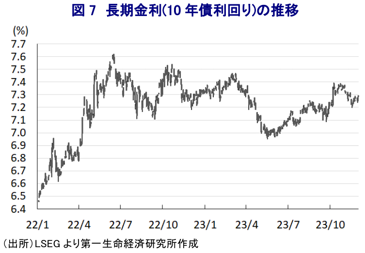 先行きの景気を巡っては、食料インフレの懸念に加え、ルピー安圧力がくすぶるなかで輸入インフレも警戒されるなか、中銀は当面は現行の引き締め姿勢を維持せざるを得ない展開が続くと見込まれるなど、景気の足かせとなる材料がくすぶることは避けられない。その一方、モディ政権は総選挙後の政権3期目入りを目指す姿勢を崩しておらず、景気下支えに向けて『何でもあり』の動きをみせていることを勘案すれば、今年度予算において盛り込まれたインフラ投資の拡充をはじめとする公共投資拡大の動きが内需を下支えする展開が続くと見込まれる。ただし、コロナ禍を経て財政状況は悪化するなかで景気は公的需要に対する依存を強める展開は、長期金利の高止まりを招くことで民間需要を圧迫するクラウディング・アウトを招くなど中長期的な観点で潜在成長率の低下に繋がる可能性に留意する必要がある。また、外需については、コロナ禍からの世界経済の回復をけん引してきた欧米など主要国景気は物価高と金利高の共存状態が長期化するなかで頭打ちの様相をみせており、中国景気も勢いを欠く動きが続くと見込まれるなど、世界貿易の萎縮に繋がる展開も予想される。インド経済については輸出依存度が相対的に低いものの、輸出の大宗を欧米のほか、中東やアフリカなど資源価格の動向の影響を受けやすいことを勘案すれば、外需が景気の追い風となる状況は考えにくい。その意味では、当面の景気は一進一退の動きが続くと見込まれるものの、年末にかけては昨年末にかけてテクニカル・リセッションに陥った反動が出やすいことを勘案すれば、前年比ベースの成長率は堅調な推移が続く余地は大きいと見込まれる。当研究所は先月公表した最新の経済見通しにおいて、今年度(2023-24年度)のインドの経済成長率が+6.3%になるとしたものの(注4)、7-9月のGDP統計は前提を上回る内容となったため、これを反映して+6.6%に上方修正する。