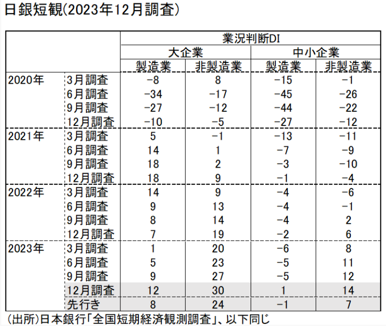 日銀は、3月会合か、4月会合のいずれかでマイナス金利解除に動くだろう。もしも、3月会合に動くのならば、12月調査が1つ手前の短観結果となる。今回の結果は、3月解除に向けて前向きな結果である。