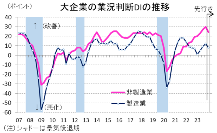 こうした設備投資の数字は、収益計画の上昇修正によって後押しされている。企業のキャッシュフローが厚くなれば、設備投資も増えるという原理だ。仮に、今後、日銀がマイナス金利解除をすれば、特に中小企業の設備投資にはマイナス効果が及びやすいだろう。しかし、短観をみる限りは中小企業の設備投資は堅調なので、その勢いが大きく崩れそうには感じられない。