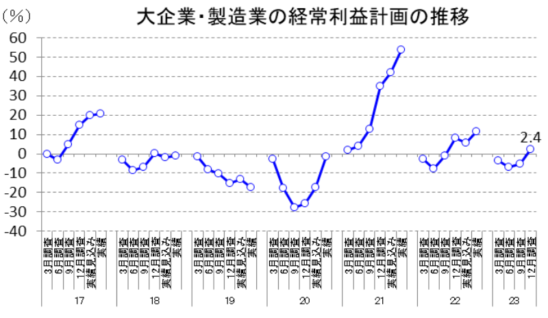 なお、想定為替レートは、9月調査1ドル135.75円から12月調査1ドル139.35円に円安修正されている。下期は139.97円である。たとえ日銀の緩和修正観測から2024年初に円高が進んだとしても、企業の想定為替レートはまだ十分なほどに円安水準を予想しているのだ。