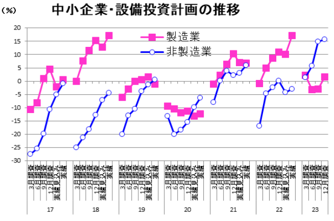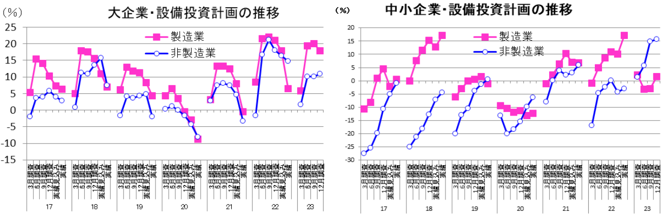 企業の国内設備投資計画は、今までと同様に2桁の強い伸び率を示している。大企業・製造業は前年比17.9%、大企業・非製造業は前年比11.0%の増加である。中小企業・製造業もプラス計画に転じてきた(9月調査▲3.0%→12月調査1.6%)。この数字は、2024年3月・6月調査でさらに上積みされていく公算が高い。