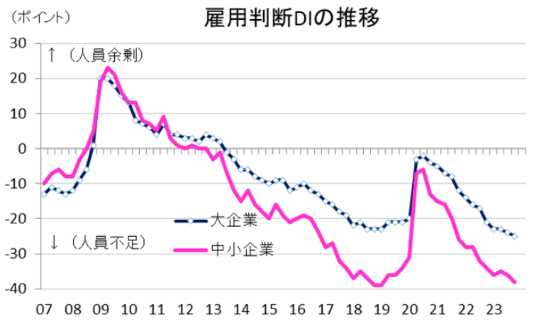 植田総裁は、ことのほか賃上げに注目している。12月調査では、雇用人員判断DIが大企業・全産業で前回比▲1ポイントほど「不足」の方向に変化した。中小企業・全産業は前回比▲2ポイントの変化だった。着実に、人手不足感は強まっている。